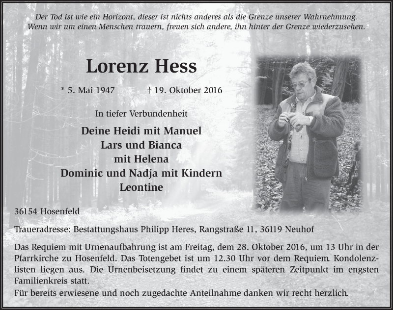 Hier finden Sie alle Traueranzeigen aus der Zeitung, die bisher für Lorenz Hess erschienen sind. Weitere Traueranzeigen, die in der Zeitung erscheinen, werden hier ebenfalls aufgelistet