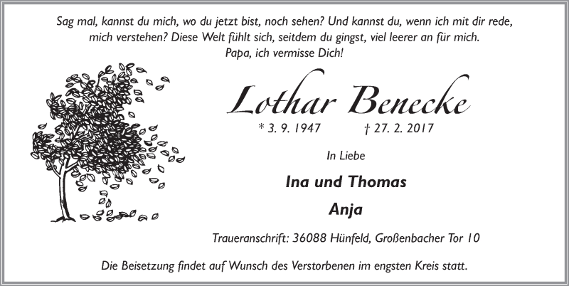 Hier finden Sie alle Traueranzeigen aus der Zeitung, die bisher für Lothar Benecke erschienen sind. Weitere Traueranzeigen, die in der Zeitung erscheinen, werden hier ebenfalls aufgelistet