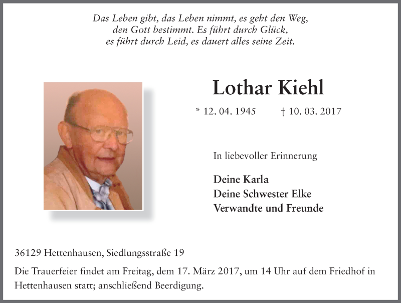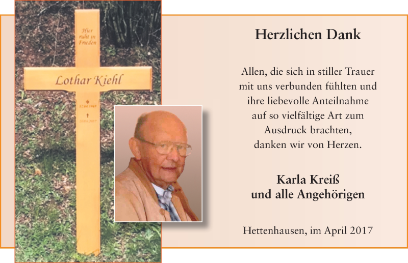 Hier finden Sie alle Traueranzeigen aus der Zeitung, die bisher für Lothar Kiehl erschienen sind. Weitere Traueranzeigen, die in der Zeitung erscheinen, werden hier ebenfalls aufgelistet