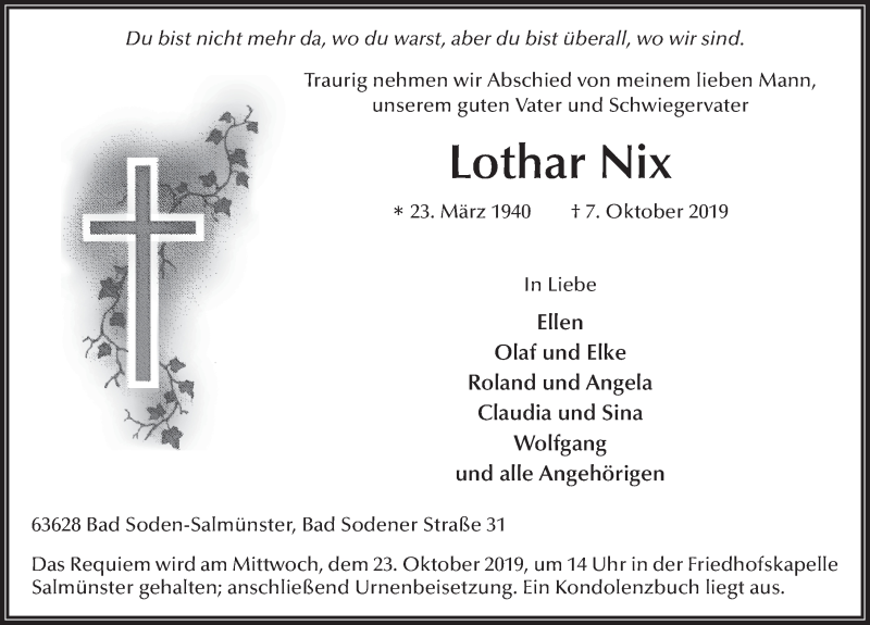 Hier finden Sie alle Traueranzeigen aus der Zeitung, die bisher für Lothar Nix erschienen sind. Weitere Traueranzeigen, die in der Zeitung erscheinen, werden hier ebenfalls aufgelistet