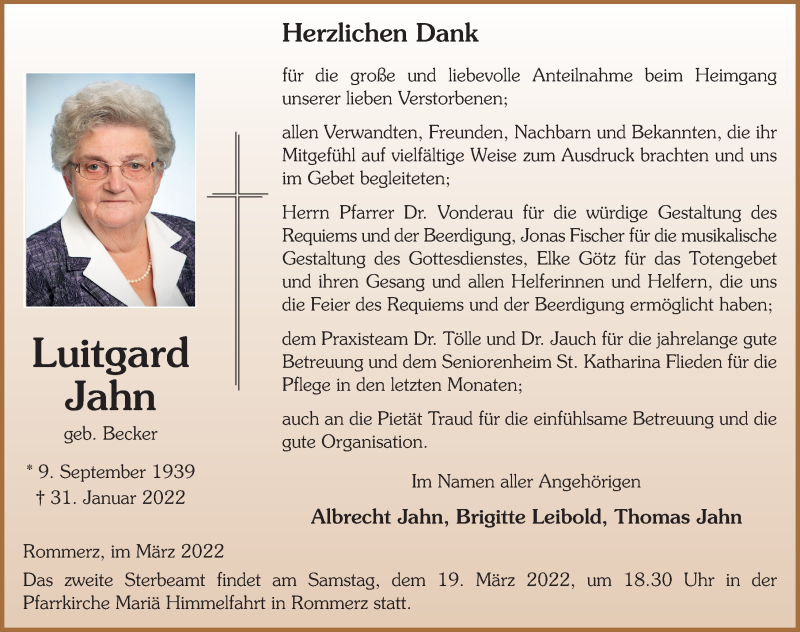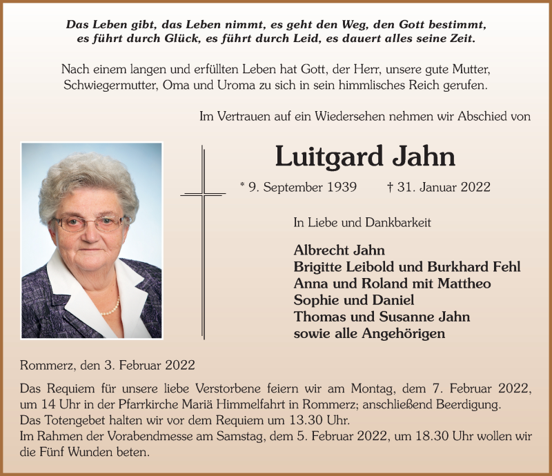 Hier finden Sie alle Traueranzeigen aus der Zeitung, die bisher für Luitgard Jahn erschienen sind. Weitere Traueranzeigen, die in der Zeitung erscheinen, werden hier ebenfalls aufgelistet