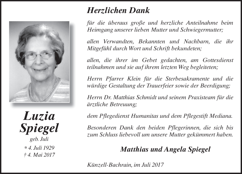Hier finden Sie alle Traueranzeigen aus der Zeitung, die bisher für Luzia Spiegel erschienen sind. Weitere Traueranzeigen, die in der Zeitung erscheinen, werden hier ebenfalls aufgelistet