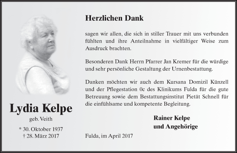 Hier finden Sie alle Traueranzeigen aus der Zeitung, die bisher für Lydia Kelpe erschienen sind. Weitere Traueranzeigen, die in der Zeitung erscheinen, werden hier ebenfalls aufgelistet