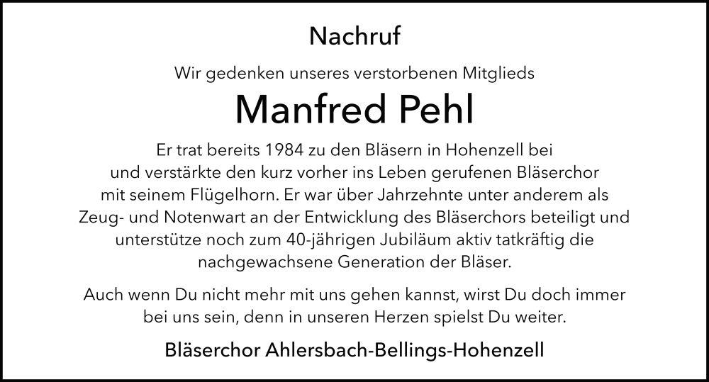 Hier finden Sie alle Traueranzeigen aus der Zeitung, die bisher für Manfred Pehl erschienen sind. Weitere Traueranzeigen, die in der Zeitung erscheinen, werden hier ebenfalls aufgelistet