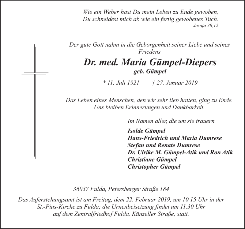 Hier finden Sie alle Traueranzeigen aus der Zeitung, die bisher für Maria Gümpel-Diepers erschienen sind. Weitere Traueranzeigen, die in der Zeitung erscheinen, werden hier ebenfalls aufgelistet