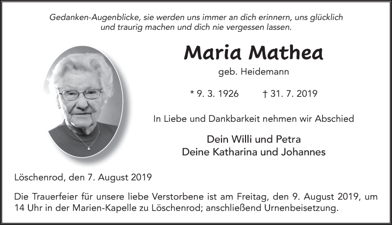 Hier finden Sie alle Traueranzeigen aus der Zeitung, die bisher für Maria Mathea erschienen sind. Weitere Traueranzeigen, die in der Zeitung erscheinen, werden hier ebenfalls aufgelistet