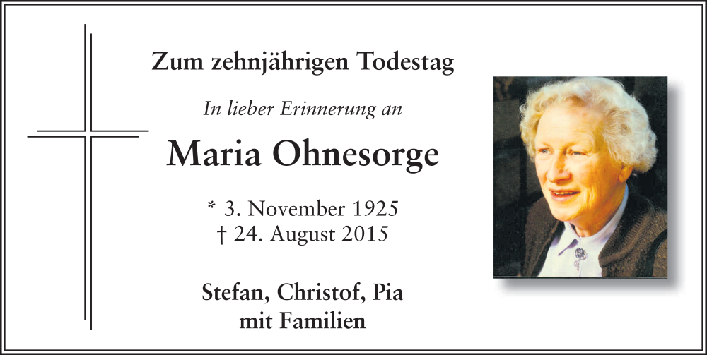 Hier finden Sie alle Traueranzeigen aus der Zeitung, die bisher für Maria Ohnesorge erschienen sind. Weitere Traueranzeigen, die in der Zeitung erscheinen, werden hier ebenfalls aufgelistet