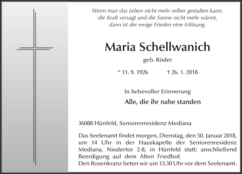 Hier finden Sie alle Traueranzeigen aus der Zeitung, die bisher für Maria Schellwanich erschienen sind. Weitere Traueranzeigen, die in der Zeitung erscheinen, werden hier ebenfalls aufgelistet