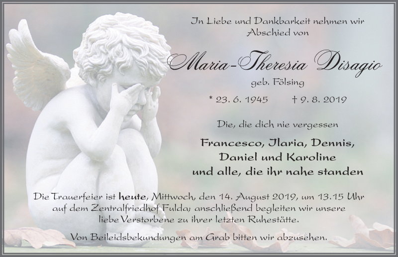 Hier finden Sie alle Traueranzeigen aus der Zeitung, die bisher für Maria-Theresia Disagio erschienen sind. Weitere Traueranzeigen, die in der Zeitung erscheinen, werden hier ebenfalls aufgelistet