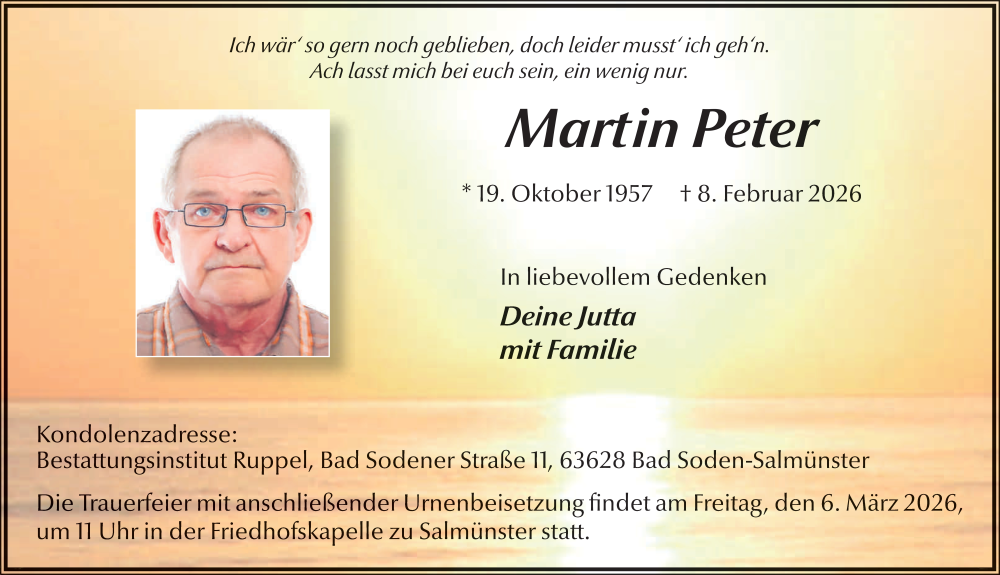 Hier finden Sie alle Traueranzeigen aus der Zeitung, die bisher für Martin Peter erschienen sind. Weitere Traueranzeigen, die in der Zeitung erscheinen, werden hier ebenfalls aufgelistet