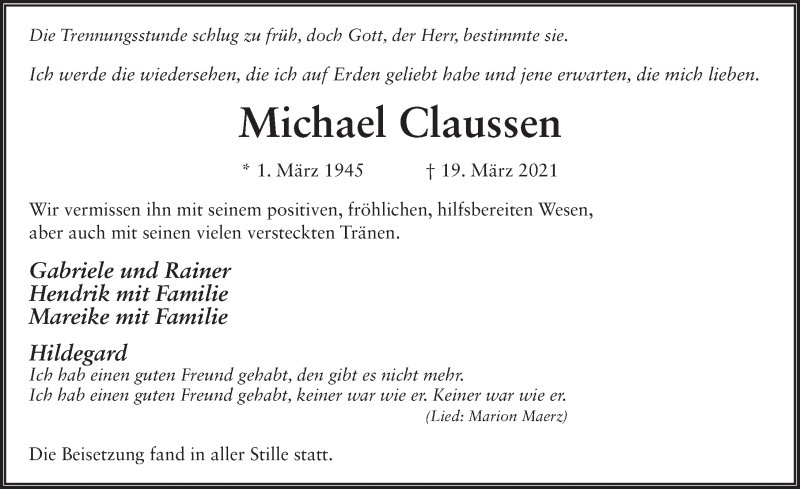 Hier finden Sie alle Traueranzeigen aus der Zeitung, die bisher für Michael Claussen erschienen sind. Weitere Traueranzeigen, die in der Zeitung erscheinen, werden hier ebenfalls aufgelistet