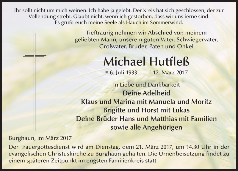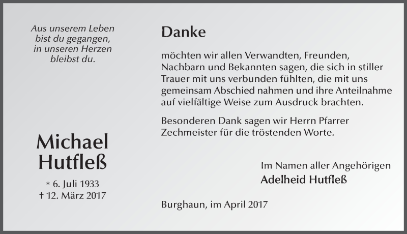 Hier finden Sie alle Traueranzeigen aus der Zeitung, die bisher für Michael Hutfleß erschienen sind. Weitere Traueranzeigen, die in der Zeitung erscheinen, werden hier ebenfalls aufgelistet