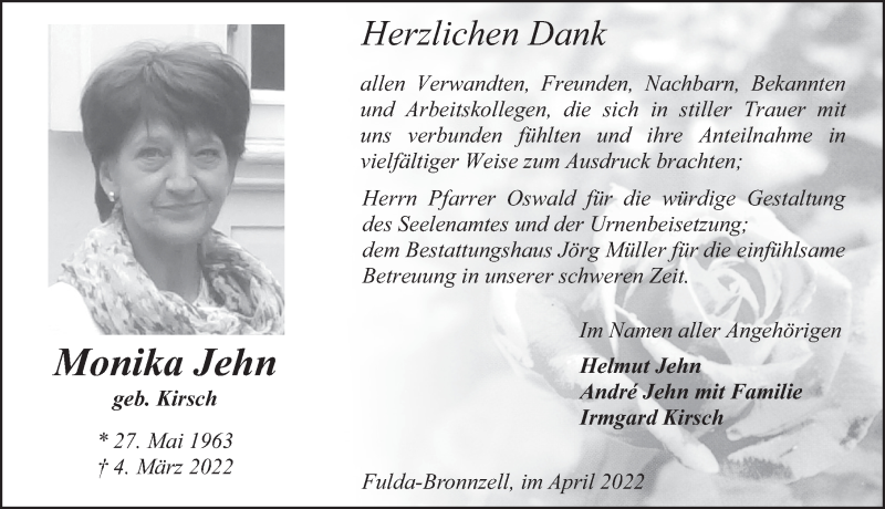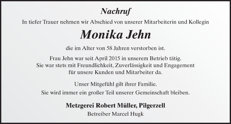 Hier finden Sie alle Traueranzeigen aus der Zeitung, die bisher für Monika Jehn erschienen sind. Weitere Traueranzeigen, die in der Zeitung erscheinen, werden hier ebenfalls aufgelistet