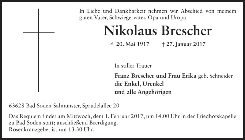 Hier finden Sie alle Traueranzeigen aus der Zeitung, die bisher für Nikolaus Brescher erschienen sind. Weitere Traueranzeigen, die in der Zeitung erscheinen, werden hier ebenfalls aufgelistet