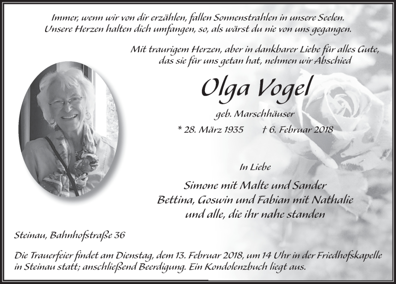 Hier finden Sie alle Traueranzeigen aus der Zeitung, die bisher für Olga Vogel erschienen sind. Weitere Traueranzeigen, die in der Zeitung erscheinen, werden hier ebenfalls aufgelistet