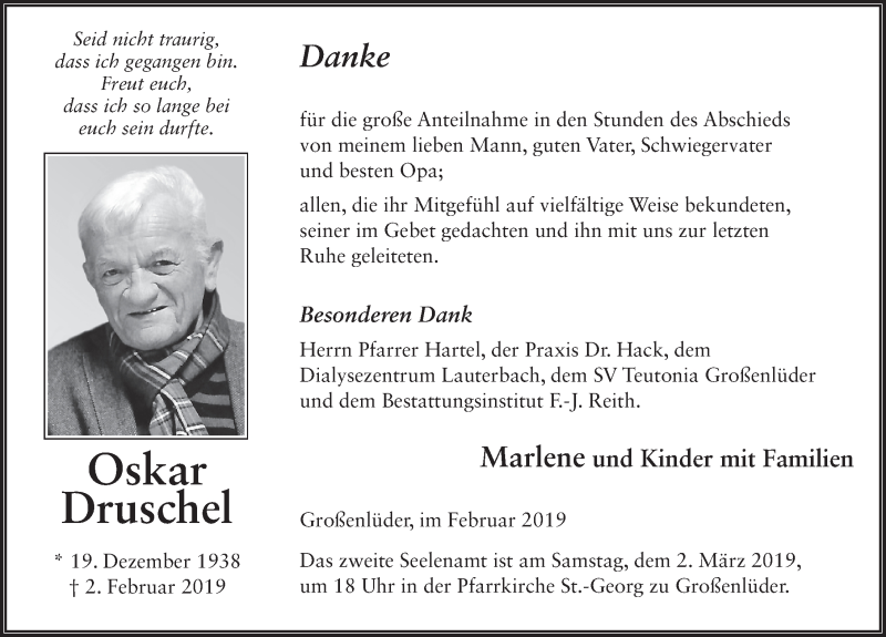 Hier finden Sie alle Traueranzeigen aus der Zeitung, die bisher für Oskar Druschel erschienen sind. Weitere Traueranzeigen, die in der Zeitung erscheinen, werden hier ebenfalls aufgelistet