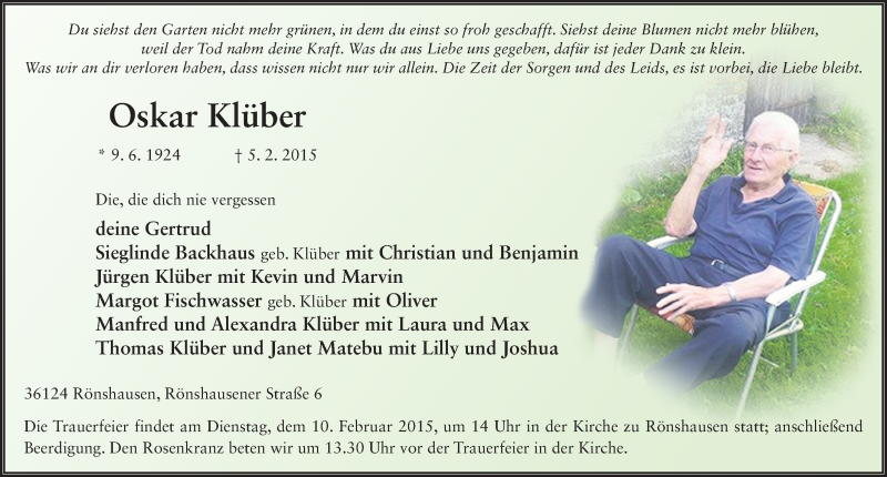 Hier finden Sie alle Traueranzeigen aus der Zeitung, die bisher für Oskar Klüber erschienen sind. Weitere Traueranzeigen, die in der Zeitung erscheinen, werden hier ebenfalls aufgelistet