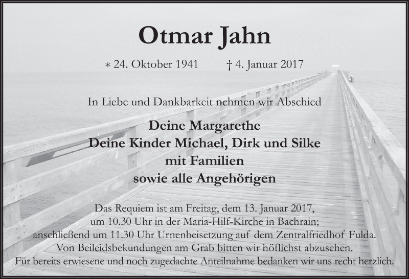 Hier finden Sie alle Traueranzeigen aus der Zeitung, die bisher für Otmar Jahn erschienen sind. Weitere Traueranzeigen, die in der Zeitung erscheinen, werden hier ebenfalls aufgelistet