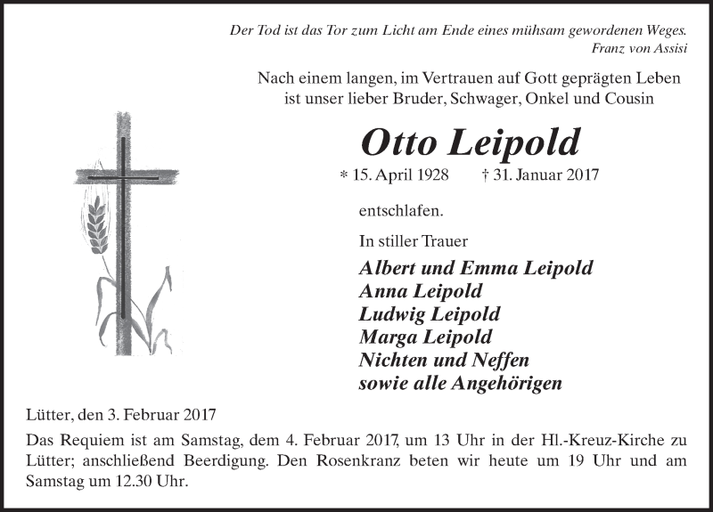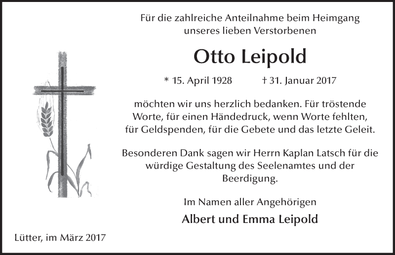 Hier finden Sie alle Traueranzeigen aus der Zeitung, die bisher für Otto Leipold erschienen sind. Weitere Traueranzeigen, die in der Zeitung erscheinen, werden hier ebenfalls aufgelistet