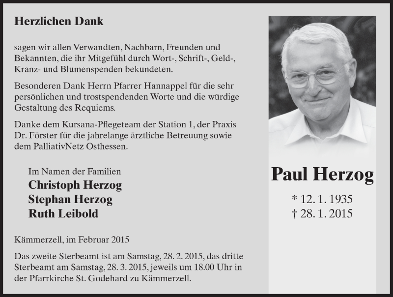 Hier finden Sie alle Traueranzeigen aus der Zeitung, die bisher für Paul Herzog erschienen sind. Weitere Traueranzeigen, die in der Zeitung erscheinen, werden hier ebenfalls aufgelistet