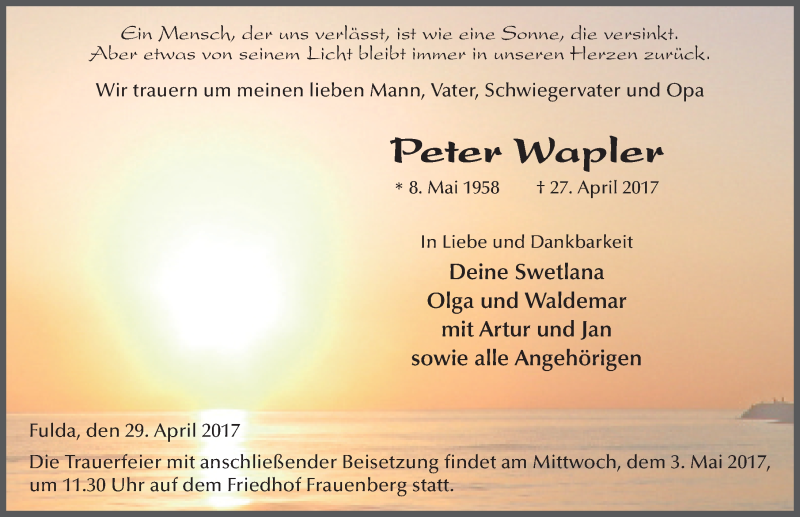 Hier finden Sie alle Traueranzeigen aus der Zeitung, die bisher für Peter Wapler erschienen sind. Weitere Traueranzeigen, die in der Zeitung erscheinen, werden hier ebenfalls aufgelistet