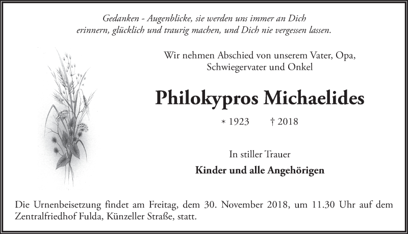Hier finden Sie alle Traueranzeigen aus der Zeitung, die bisher für Philokypros Michaelides erschienen sind. Weitere Traueranzeigen, die in der Zeitung erscheinen, werden hier ebenfalls aufgelistet