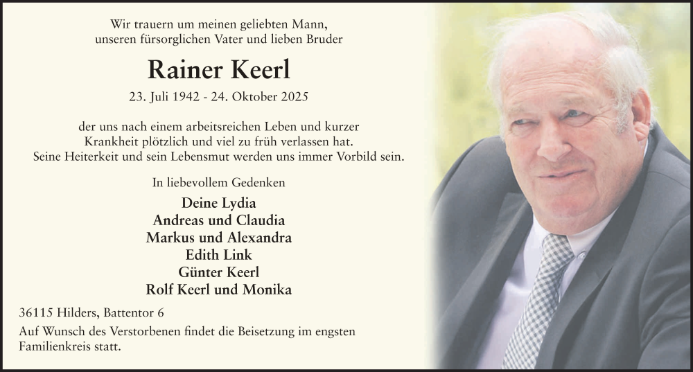 Hier finden Sie alle Traueranzeigen aus der Zeitung, die bisher für Rainer Keerl erschienen sind. Weitere Traueranzeigen, die in der Zeitung erscheinen, werden hier ebenfalls aufgelistet