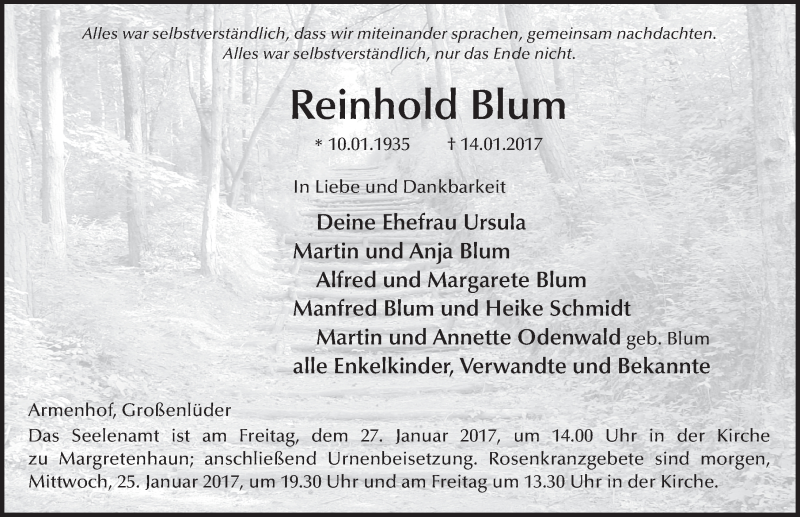 Hier finden Sie alle Traueranzeigen aus der Zeitung, die bisher für Reinhold Blum erschienen sind. Weitere Traueranzeigen, die in der Zeitung erscheinen, werden hier ebenfalls aufgelistet