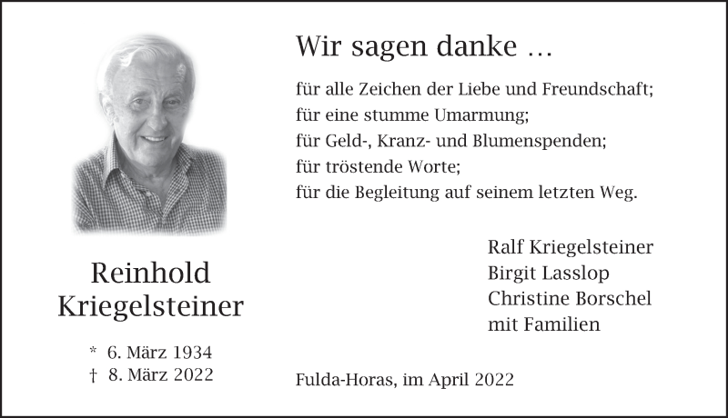 Hier finden Sie alle Traueranzeigen aus der Zeitung, die bisher für Reinhold Kriegelsteiner erschienen sind. Weitere Traueranzeigen, die in der Zeitung erscheinen, werden hier ebenfalls aufgelistet