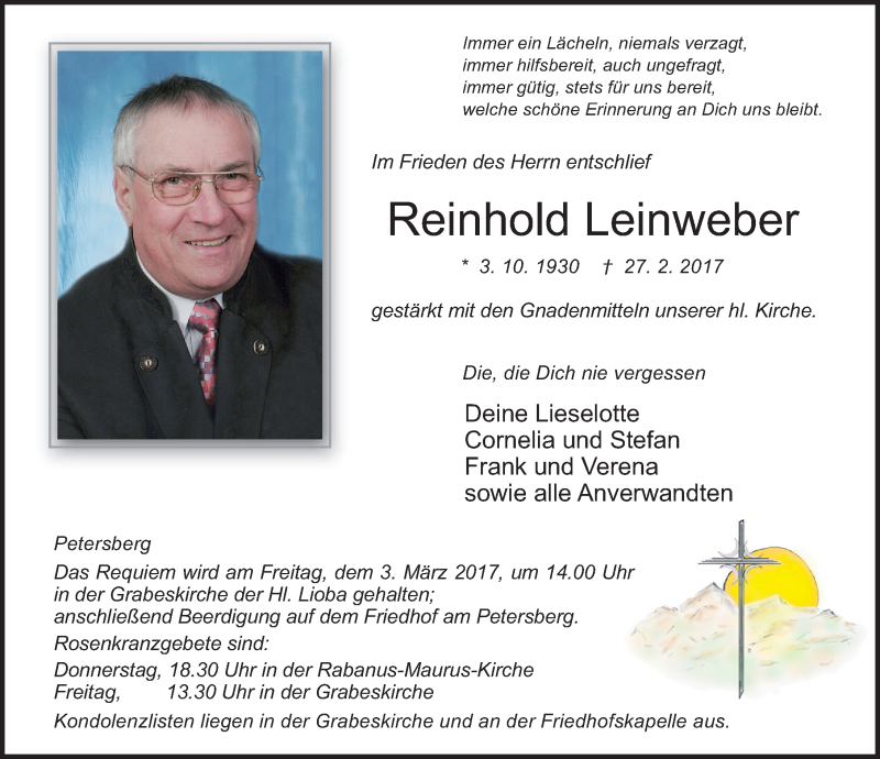 Hier finden Sie alle Traueranzeigen aus der Zeitung, die bisher für Reinhold Leinweber erschienen sind. Weitere Traueranzeigen, die in der Zeitung erscheinen, werden hier ebenfalls aufgelistet