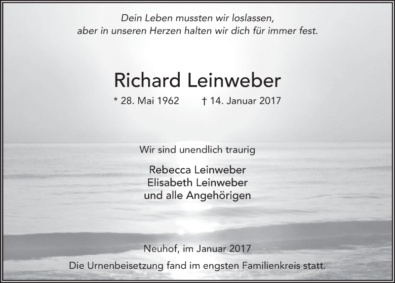 Hier finden Sie alle Traueranzeigen aus der Zeitung, die bisher für Richard Leinweber erschienen sind. Weitere Traueranzeigen, die in der Zeitung erscheinen, werden hier ebenfalls aufgelistet