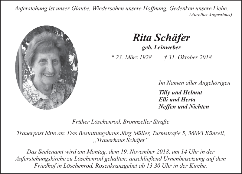 Hier finden Sie alle Traueranzeigen aus der Zeitung, die bisher für Rita Schäfer erschienen sind. Weitere Traueranzeigen, die in der Zeitung erscheinen, werden hier ebenfalls aufgelistet