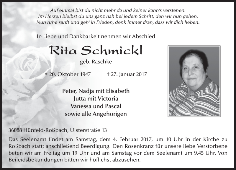 Hier finden Sie alle Traueranzeigen aus der Zeitung, die bisher für Rita Schmickl erschienen sind. Weitere Traueranzeigen, die in der Zeitung erscheinen, werden hier ebenfalls aufgelistet