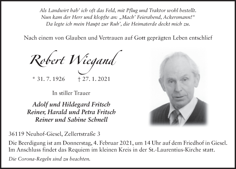 Hier finden Sie alle Traueranzeigen aus der Zeitung, die bisher für Robert Wiegand erschienen sind. Weitere Traueranzeigen, die in der Zeitung erscheinen, werden hier ebenfalls aufgelistet