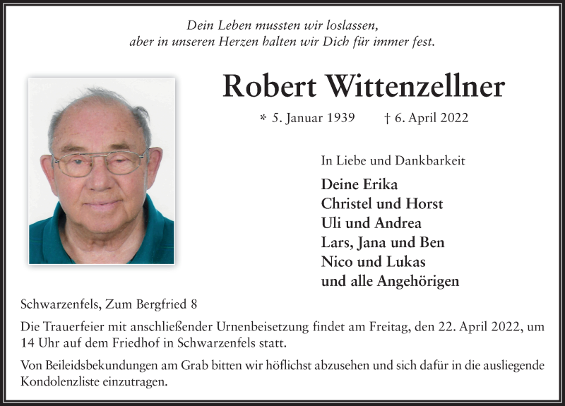 Hier finden Sie alle Traueranzeigen aus der Zeitung, die bisher für Robert Wittenzellner erschienen sind. Weitere Traueranzeigen, die in der Zeitung erscheinen, werden hier ebenfalls aufgelistet