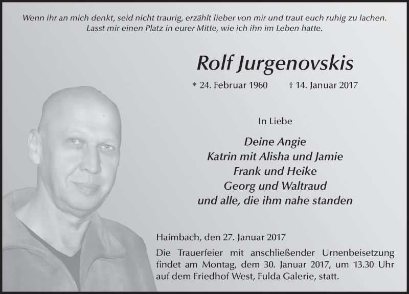 Hier finden Sie alle Traueranzeigen aus der Zeitung, die bisher für Rolf Jurgenovskis erschienen sind. Weitere Traueranzeigen, die in der Zeitung erscheinen, werden hier ebenfalls aufgelistet