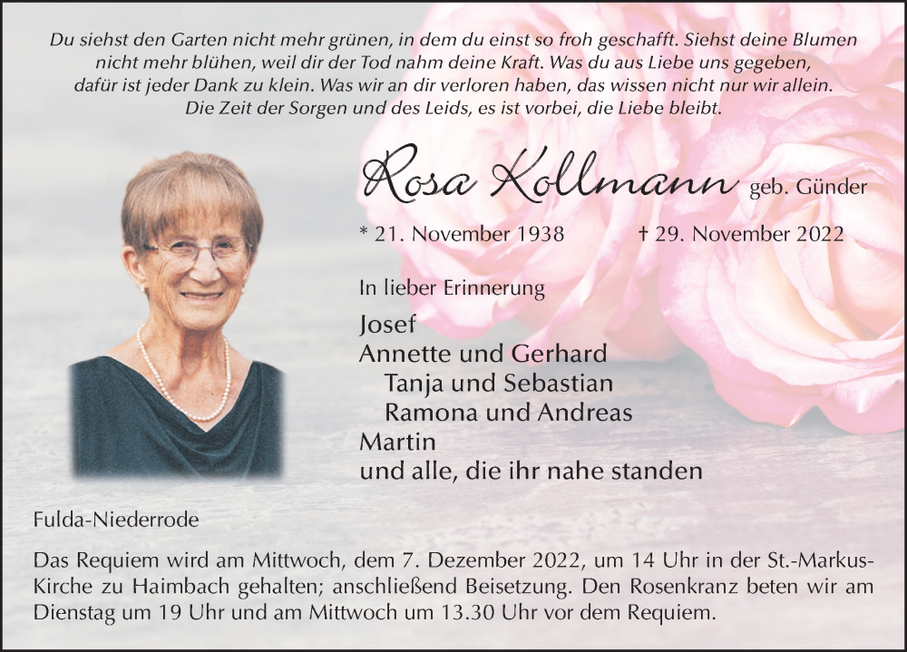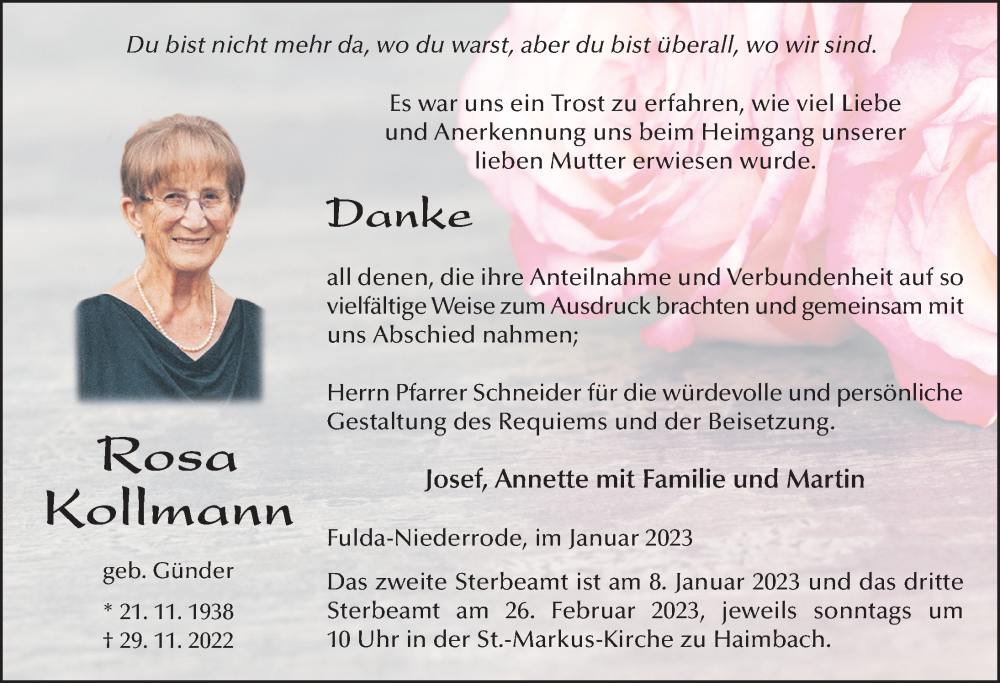 Hier finden Sie alle Traueranzeigen aus der Zeitung, die bisher für Rosa Kollmann erschienen sind. Weitere Traueranzeigen, die in der Zeitung erscheinen, werden hier ebenfalls aufgelistet