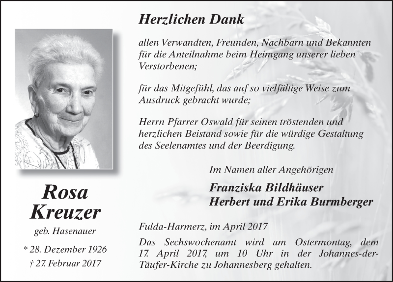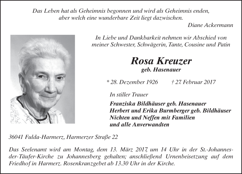 Hier finden Sie alle Traueranzeigen aus der Zeitung, die bisher für Rosa Kreuzer erschienen sind. Weitere Traueranzeigen, die in der Zeitung erscheinen, werden hier ebenfalls aufgelistet