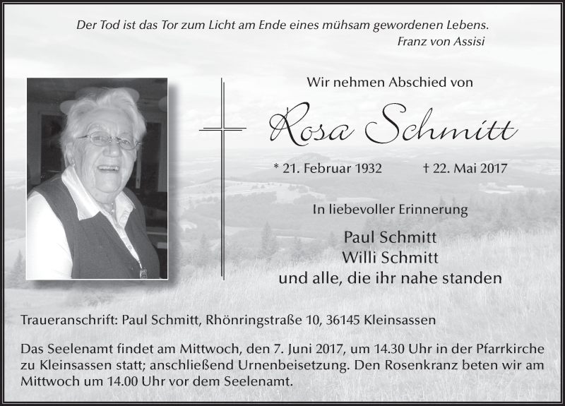 Hier finden Sie alle Traueranzeigen aus der Zeitung, die bisher für Rosa Schmitt erschienen sind. Weitere Traueranzeigen, die in der Zeitung erscheinen, werden hier ebenfalls aufgelistet
