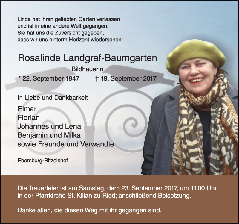 Hier finden Sie alle Traueranzeigen aus der Zeitung, die bisher für Rosalinde Landgraf-Baumgarten erschienen sind. Weitere Traueranzeigen, die in der Zeitung erscheinen, werden hier ebenfalls aufgelistet