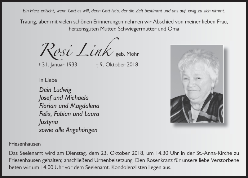 Hier finden Sie alle Traueranzeigen aus der Zeitung, die bisher für Rosi Link erschienen sind. Weitere Traueranzeigen, die in der Zeitung erscheinen, werden hier ebenfalls aufgelistet