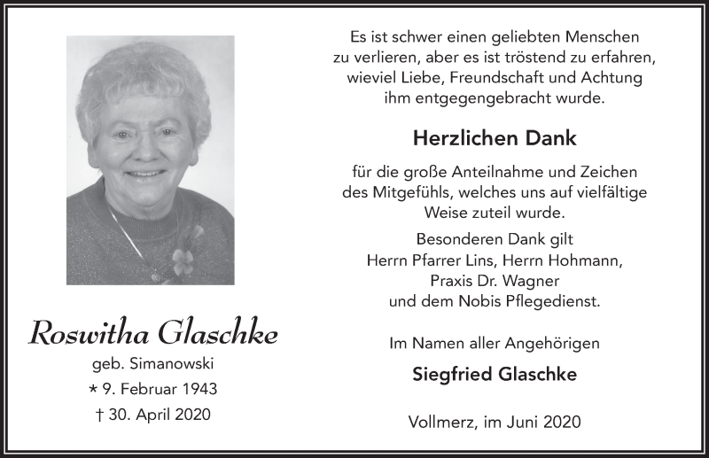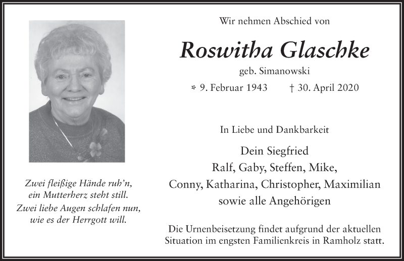 Hier finden Sie alle Traueranzeigen aus der Zeitung, die bisher für Roswitha Glaschke erschienen sind. Weitere Traueranzeigen, die in der Zeitung erscheinen, werden hier ebenfalls aufgelistet