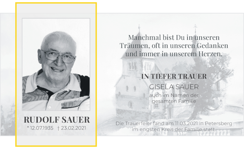 Hier finden Sie alle Traueranzeigen aus der Zeitung, die bisher für Rudolf Sauer erschienen sind. Weitere Traueranzeigen, die in der Zeitung erscheinen, werden hier ebenfalls aufgelistet