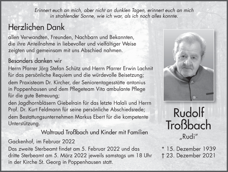 Hier finden Sie alle Traueranzeigen aus der Zeitung, die bisher für Rudolf Troßbach erschienen sind. Weitere Traueranzeigen, die in der Zeitung erscheinen, werden hier ebenfalls aufgelistet