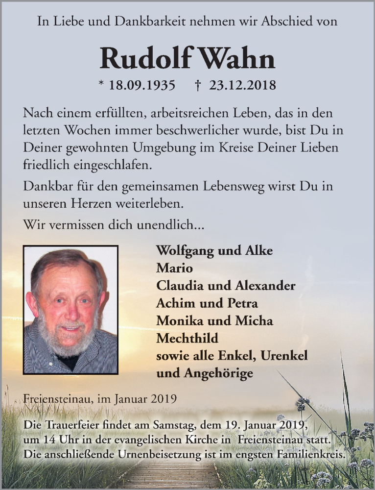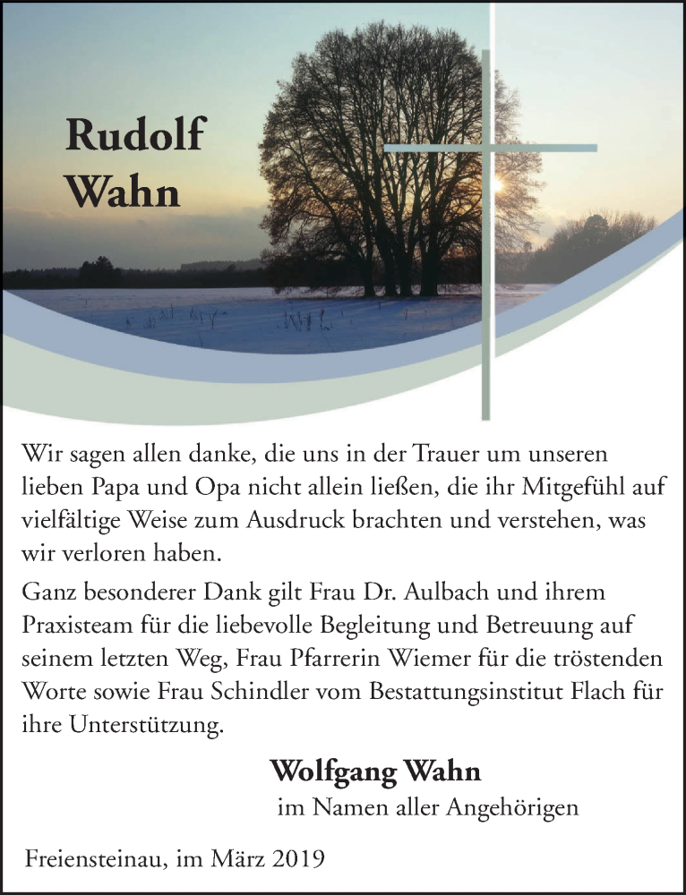 Hier finden Sie alle Traueranzeigen aus der Zeitung, die bisher für Rudolf Wahn erschienen sind. Weitere Traueranzeigen, die in der Zeitung erscheinen, werden hier ebenfalls aufgelistet