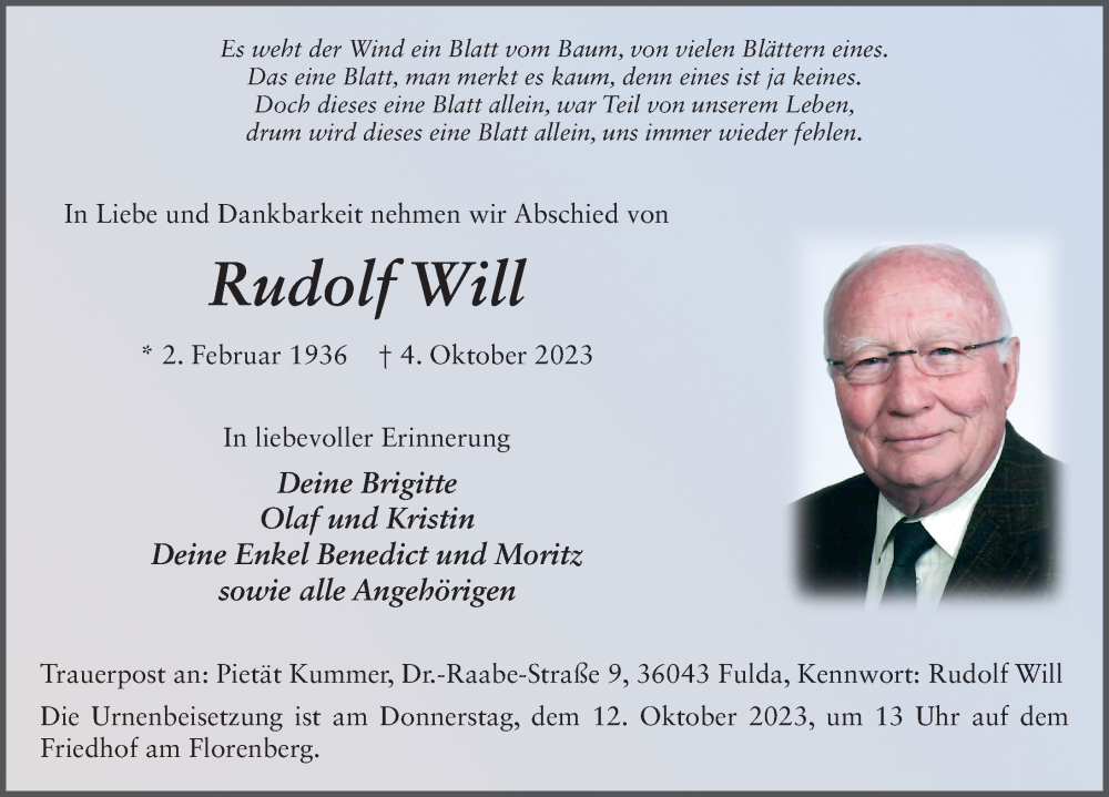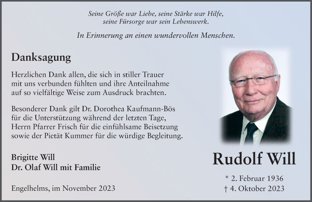 Hier finden Sie alle Traueranzeigen aus der Zeitung, die bisher für Rudolf Will erschienen sind. Weitere Traueranzeigen, die in der Zeitung erscheinen, werden hier ebenfalls aufgelistet