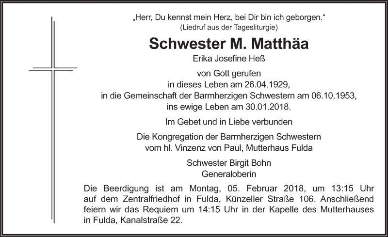 Hier finden Sie alle Traueranzeigen aus der Zeitung, die bisher für Schwester M. Matthäa erschienen sind. Weitere Traueranzeigen, die in der Zeitung erscheinen, werden hier ebenfalls aufgelistet