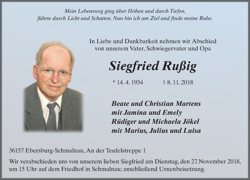 Hier finden Sie alle Traueranzeigen aus der Zeitung, die bisher für Siegfried Rußig erschienen sind. Weitere Traueranzeigen, die in der Zeitung erscheinen, werden hier ebenfalls aufgelistet
