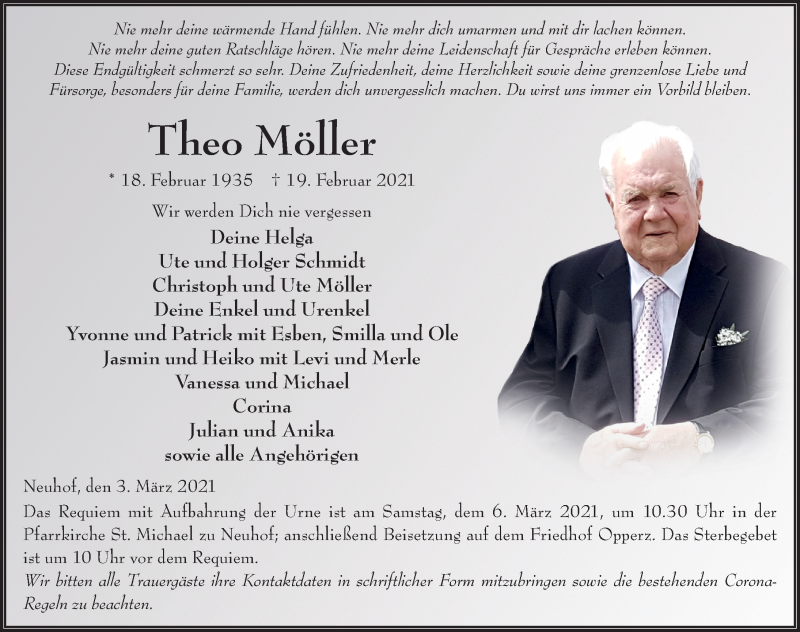Hier finden Sie alle Traueranzeigen aus der Zeitung, die bisher für Theo Möller erschienen sind. Weitere Traueranzeigen, die in der Zeitung erscheinen, werden hier ebenfalls aufgelistet