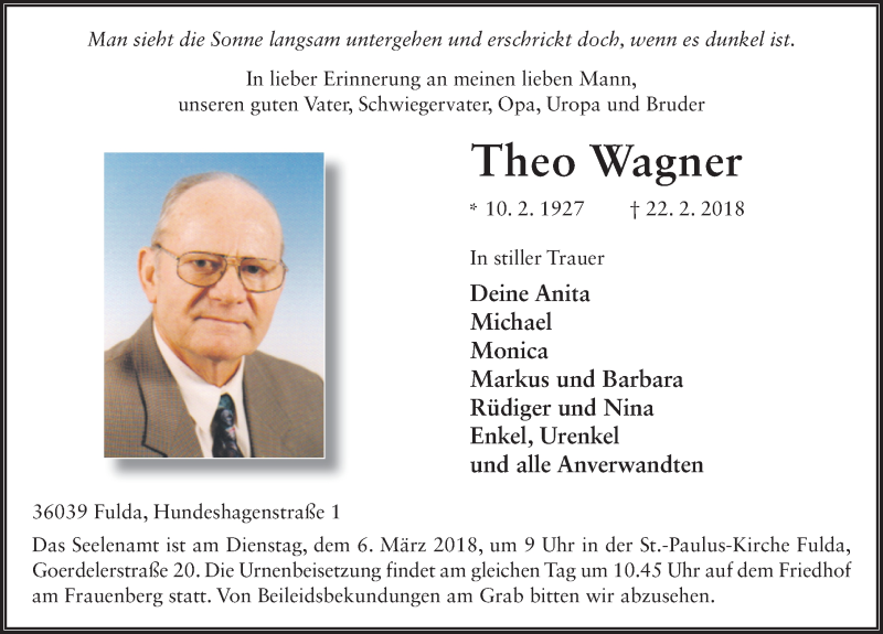 Hier finden Sie alle Traueranzeigen aus der Zeitung, die bisher für Theo Wagner erschienen sind. Weitere Traueranzeigen, die in der Zeitung erscheinen, werden hier ebenfalls aufgelistet